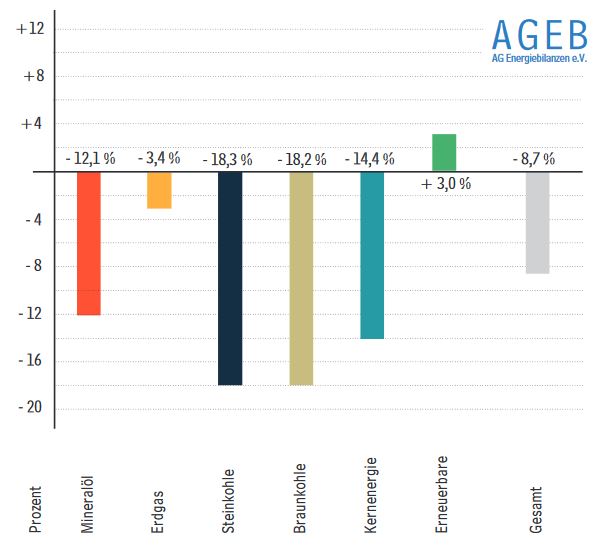 Der Verbrauch an Primärenergie in Deutschland lag 2020 um insgesamt 8,7 Prozent unter dem Niveau des Vorjahres. Nach vorläufigen Berechnungen der Arbeitsgemeinschaft Energiebilanzen erreichte der Gesamtverbrauch eine Höhe von 11.691 PJ beziehungsweise 398,8 Mio. t SKE. Mit Ausnahme der Erneuerbaren verzeichneten alle Energieträger Rückgänge.