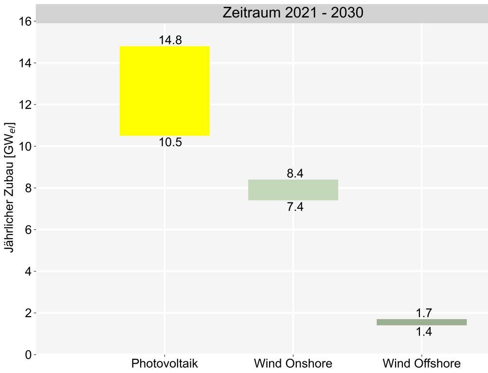 Bei Photovoltaik und Wind ist bis 2030 ein jährlicher Zubau von 10-14 GW bzw. 9 GW notwendig, um genügend CO2-frei erzeugten Strom für Deutschland zur Verfügung zu stellen – Grafik © Fraunhofer Ise
