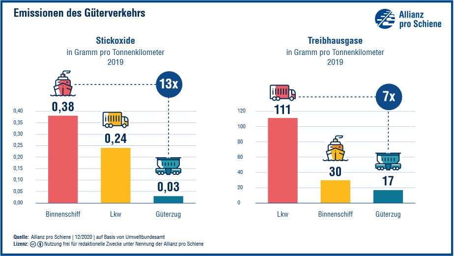 Emissionen des Güterverkehrs – Grafik © Allianz pro Schiene 12/2020 – auf Basis von Umweltbundesamt