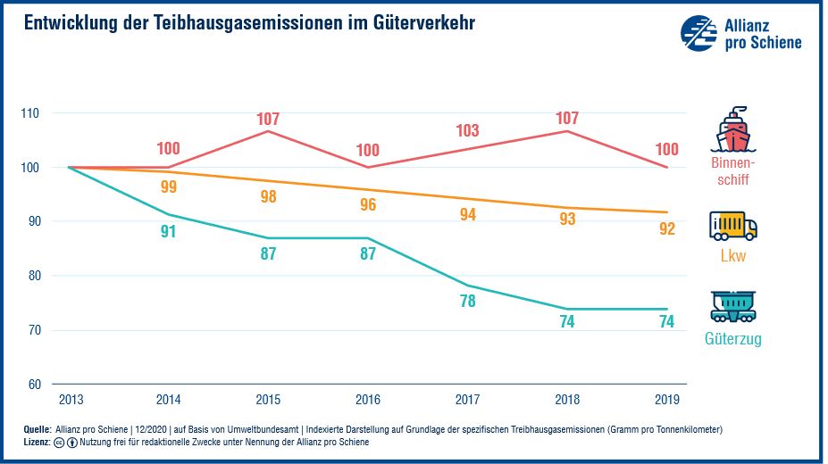 Beim Klimaschutz wird die Kluft zwischen Schienen- und Straßenverkehr immer größer, wie der Langfristvergleich der Allianz pro Schiene zeigt. Die Eisenbahnen reduzierten demnach ihre Treibhausgasemissionen zwischen 2013 und 2019 im Personen-Nahverkehr um fast ein Viertel, im Fernverkehr um ein Drittel und im Güterverkehr um gut ein Viertel.