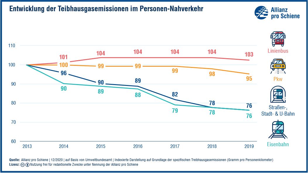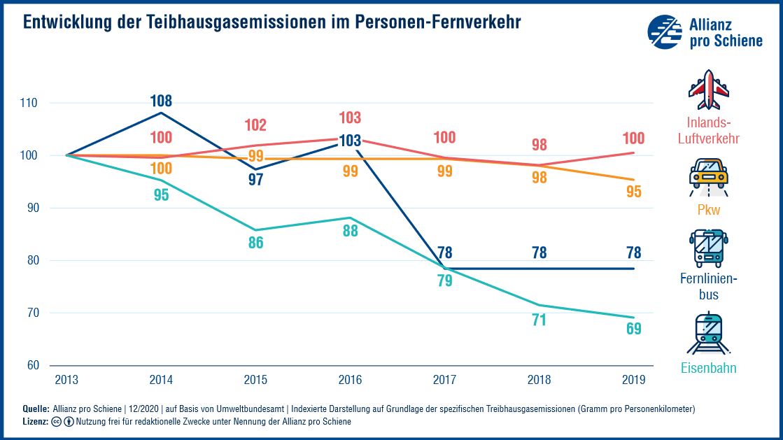 Laut den UBA-Statistiken emittierten die Eisenbahnen 2019 pro Kilometer und Person 24 Prozent weniger Treibhausgase im Nahverkehr als sechs Jahre zuvor. Bei Bussen stieg der Ausstoß um drei Prozent, bei Pkw sank er um fünf Prozent. Im Fernverkehr schlägt bei den Bahnen eine Verbesserung um 31 Prozent zu Buche. Während sich Fernbusse um 22 Prozent verbesserten, konnten Flugzeuge im Inland keine Fortschritte erzielen.