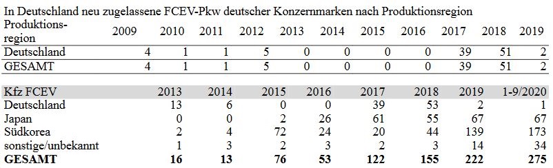 Wie viele der in Deutschland zugelassenen Brennstoffzellenfahrzeuge wurden nach Kenntnis der Bundesregierung in Deutschland hergestellt bzw. im (EU-)Ausland (bitte nach Ländern auflisten und für die vergangenen zehn Jahre aufschlüsseln)?Die Daten können der nachstehenden Tabelle entnommen werden.