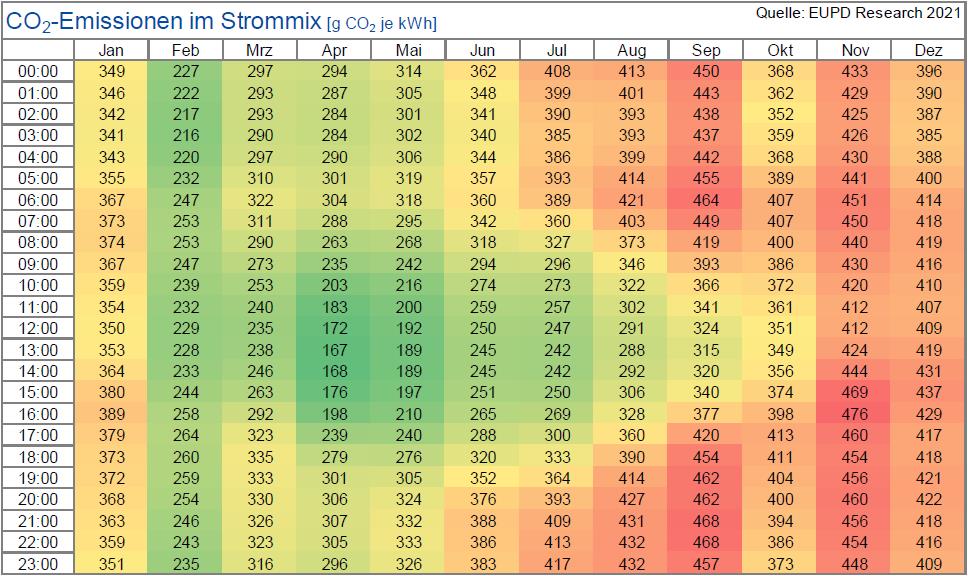 Im Rahmen der deutschen Energiewende wird Jahr um Jahr ein stetig wachsender Anteil erneuerbarer Energien registriert. Damit einher gehen leicht sinkende Emissionen der Stromerzeugung in Deutschland. Die Detailanalyse offenbart jedoch im zeitlichen Verlauf starke Unterschiede der CO2-Emissionen im deutschen Strommix innerhalb des Tages- und des Jahresverlaufs. Einerseits zeigen sich um die Mittagszeit die geringsten Kohlendioxidbelastungen, andererseits unterscheiden sich die einzelnen Monate stark voneinander.