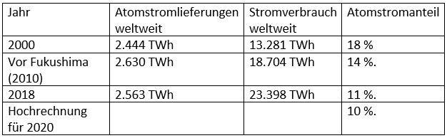 Reißerische oder uninformierte Artikel versuchten immer wieder, die Atomausstiegs-Diskussion in die Irre zu leiten. In Wirklichkeit stagnierten die Zahlen: 1970 sei mit dem Bau von 37 AKW begonnen worden, 1980 dann noch 20 neue Baustellen, 2010, im Jahr vor Fukushima, begannen die Bauarbeiten an 16 AKW, 2020 noch mit vier. Auch hier offiziöse Zahlen der IAEA. Gleichzeitig sei der weltweite Atomanteil am Gesamtstromverbrauch von „vor Fukushima“ (2000: 2.444 TWh – 18 %) bis heute (2018: 2.563 TWh 14 %) um mehr als ein Viertel gesunken – von 18 auf 10 Prozent 2020.