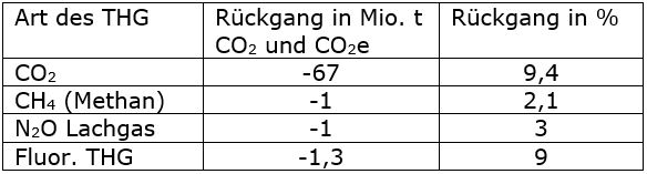Im Ergebnis gingen 2020 die Emissionen bei allen Treibhausgasen zurück. Beim dominierenden Kohlendioxid beträgt der Rückgang knapp 67 Mio. Tonnen (-9,4 Prozent). Die Methangesamtemissionen gingen um gut 1 Mio. Tonnen CO2-Äquivalente (-2,1 Prozent) zurück. Die Lachgasemissionen gingen ebenfalls um gut 1 Mio. Tonnen CO2-Äquivalente zurück (-3 Prozent). Die Emissionen von fluorierten Treibhausgasen gingen 2020 aufgrund sinkender Bestands- und Befüllungsemissionen um 1,3 Mio. Tonnen CO2-Äquivalente (-9 Prozent) weiter zurück.