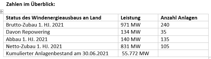 Eine Medienmitteilung des Bundesverbands Windenergie vom 27.07.2021: Ausbauzahlen Windenergie an Land für das erste Halbjahr 2021 in Deutschland: 62 Prozent Wachstum gegenüber dem Vorjahreszeitraum beim Ausbau im ersten Halbjahr 2021 in Deutschland mit 971 MW – Klimawandel und CO2-Minderungsziele erfordern schnelleren Ausbau der Windenergie – Tempo für Flächenausweisung und den Abbau von Genehmigungshemmnissen muss jetzt massiv erhöht werden.