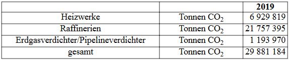 Nach dem Projektionsbericht 2019 entfallen im Jahr 2030 auf die „Heizwerke“ 10,6 Millionen Tonnen CO2-Äquivalente, auf die „Raffinerien“ 13,7 Millionen Tonnen CO2-Äquivalente und auf die „Erdgasverdichter/Pipelineverdichter“ 1,1 Millionen Tonnen CO2-Äquivalente. (https://cdr.eionet.europa.eu/de/eu/mmr/art04-13-14_lcds_pams_projections/projections/envxnw7wq/Projektionsbericht-der-Bundesregierung-2019.pdf).