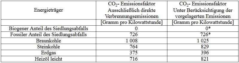 Die in der folgenden Tabelle dargestellten CO2-Emissionsfaktoren beziehen sich auf die Bruttostromerzeugung. Es handelt sich hierbei um eine Durchschnittsbetrachtung der in Deutschland im Jahr 2020 installierten Kraftwerke. Neben den direkten Verbrennungsemissionen werden auch die vorgelagerten Emissionen, welche zum Beispiel beim Abbau und Transport fossiler Energieträger entstehen, ausgewiesen. Zudem werden bei den dargestellten Emissionsfaktoren die Primärenergieeinsparungen aus der Kraft-Wärme-Kopplungs-(KWK-)Nutzung in Anlehnung an die Richtlinie 2004/8/EG des Europäischen Parlaments und des Rates vom 11. Februar 2004 berücksichtigt.