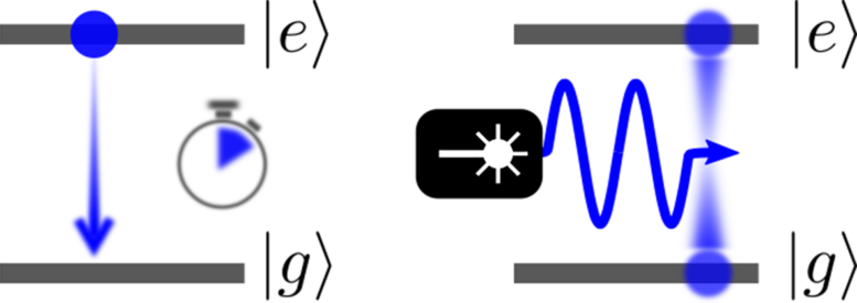 Messungen der natürlichen Lebensdauer basieren meist auf einer direkten Beobachtung des Zerfalls vom angeregten Zustand |e> in den Grundzustand |g>. Im neuen Verfahren (re.) induziert ein Laser schnelle Oszillationen zwischen den Zuständen. Bei Kenntnis der Laserintensität erlaubt die Messung der Oszillationsfrequenz eine alternative Bestimmung der Lebensdauer – Grafik © ptb.de, CC BY 4.0