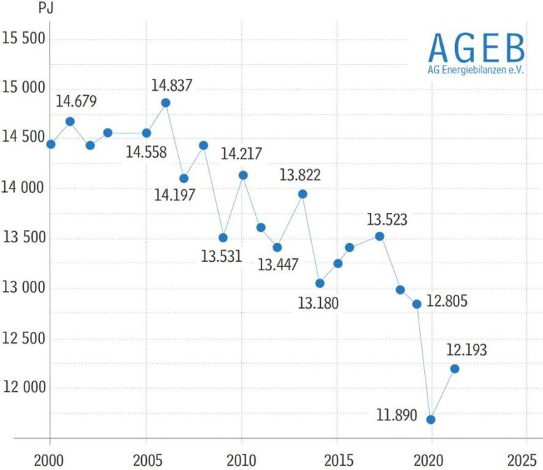 Entwicklung des Primärenergieverbrauchs in Deutschland 2000-2021 – Der Energieverbrauch in Deutschland erreichte im Jahr 2021 nach vorläufigen Berechnungen der AG Energiebilanzen eine Höhe von 12.193 Petajoule (PJ) beziehungsweise 416,1 Millionen Tonnen Steinkohleneinheiten (Mio. t SKE) und lag damit um 2,6 Prozent über dem Wert von 2020. Der Energieverbrauch war aber deutlich niedriger als in den Vorjahren – © AGEB_Pressedienst_06_2021-3