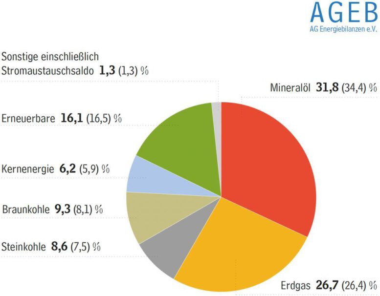 Struktur des Primärenergieverbrauchs in Deutschland 2021 – Der Verbrauch an Primärenergie verzeichnete 2021 einen Zuwachs um 2,6 Prozent auf 12.193 Petajoule (PJ) beziehungsweise 416,1 Millionen Tonnen Steinkohleneinheiten (Mio. t SKE). Der Anstieg ist auf die kühlere Witterung sowie auf den Wiederanstieg der wirtschaftlichen Leistung zurückzuführen. Das Verbrauchsniveau liegt aber immer deutlich unter dem Niveau von 2019 – © AGEB_Pressedienst_06_2021-2