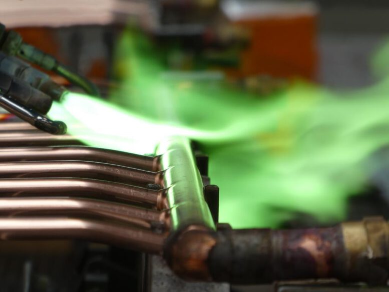 Löten der Kupferrohre eines Solarthermiemoduls – Foto © Gerhard Hofmann für Solarify