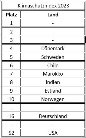 Im jährlichen weltweiten Klimaschutzranking ist Deutschland (vonPlatz 13) auf Platz 16 abgerutscht, so tagesschau.de und Germanwatch am 14.11.2022. Der Grund: die hohen Verkehrsemissionen, so die Autoren der Untersuchung, Jan Burck, von German Watch und Niklas Höhne vom NewClimate Institute. Die ersten drei Plätze wurden, wie schon in früheren Jahren, nicht besetzt, sie blieben weiß. Burck: „Die ersten drei Plätze konnten wir nicht vergeben, weil kein Land genug unternimmt, um gefährlichen Klimawandel zu vermeiden“. Als bestes Land in Sachen Klimaschutz landet Dänemark auf Platz vier, gefolgt von Schweden und Chile.