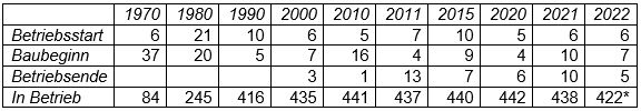 2022 wurden weltweit sechs AKW in Betrieb genommen, fünf offiziell abgeschaltet und fünfzehn in Japan bereits stillliegende AKW leise aus der Offiziellen Statistik „bereinigt“. Baubeginn war für sieben AKW. Zum Vergleich: 1970 wurde mit dem Bau von 37 AKW begonnen.