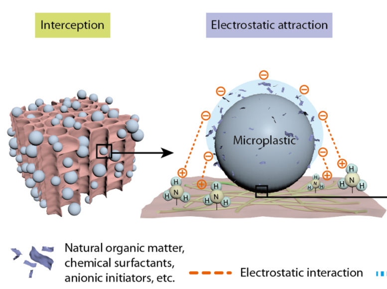 Der Durchbruch basiert auf einem speziellen Biomasse-Verbund aus Baumwollzellulose und Chitin von Tintenfischknochen: Die stark poröse und dennoch miteinander verbundene, positiv geladene Struktur zieht die Kunststoffpartikel effektiv aus dem Wasser, wie das Forscherteam den Mechanismus in der Fachzeitschrift Science Advances beschreibt.