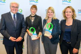 Bundespräsident Frank-Walter Steinmeier hat am 29.10.2023 in Lübeck der Holzbau-Pionierin Dipl.-Ing. Dagmar Fritz-Kramer (links) und Klimaforscherin Prof. Dr. Friederike Otto „aus ganzem Herzen“ zum diesjährigen Deutschen Umweltpreis der Deutschen Bundesstiftung Umwelt (DBU) gratuliert. Die Gratulation für den „hoch angesehenen“ Preis sei zugleich „eine erneute Mahnung und Aufforderung an uns alle“, so Steinmeier in seiner Rede beim Festakt in der Musik- und Kongresshalle. „Wir müssen uns, unsere Gewohnheiten und unsere Lebensweise noch in vielem ändern, um der großen Herausforderung des Klimawandels gerecht zu werden“, sagte er. (Foto: Preisträgerinnen Deutscher Umweltpreis: Dipl.-Ing. Dagmar Fritz-Kramer (zweite von links) und Klimaforscherin Prof. Dr. Friederike Otto – © Peter Himsel, DBU) weiterlesen…