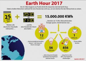 Um ein Zeichen für den Klimaschutz zu setzen, schalteten Menschen am 25.03.2016 um 20:30 Uhr deutscher Zeit zum zehnten Mal weltweit für eine Stunde das Licht aus. Würden allein alle deutschen Haushalte mitmachen, ließen sich nach Berechnungen von